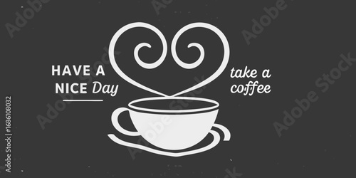 Have a nice day take a coffee with heart shaped steam from cup on dark background