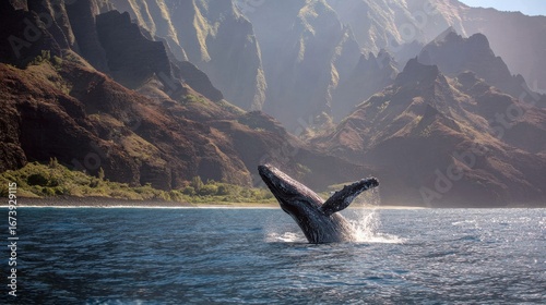Hawaii Whale Watching on Na Pali Coast: Breaching Humpback Whale and Napali Mountains Landscape