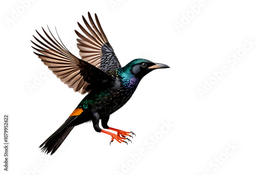 Hawaiian Oo Bird in Flight Against Black background. Its orangetipped legs and wings spread wide add to the dynamic composition."