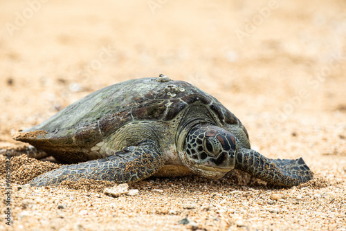 Hawksbill sea turtle going back into the water coming from the beach after laying eggs.