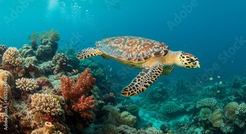 Hawksbill Sea Turtle Gracefully Navigating Vibrant Coral Reef.