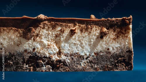 Hazelnut-chocolate semifreddo slice, frosty edges visible, deep navy-blue backdrop, dramatic negative space