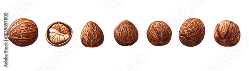 Hazelnuts in different stages, arranged in a row, on a white isolated background. transparent background