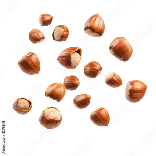 Hazelnuts scattered on white background showcasing their rich texture and natural shine
