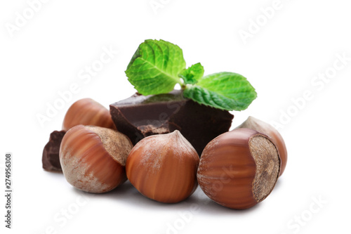 Hazelnuts with chocolate and mint leafs isolated on white background