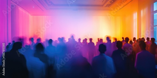 Hazy figures at a corporate seminar featuring abstract components and soft, ambient lighting.