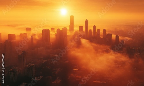 Hazy Sunrise Over Seattle Buildings Aerial View