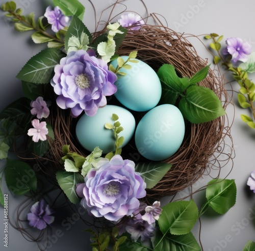 hd easter eggs in a nest, green leaves and flower,