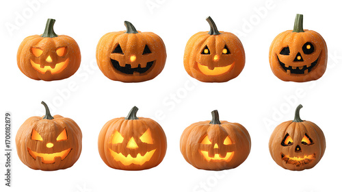 HD realistic clipart set of glowing jack-o-lantern faces floating isolated on white background