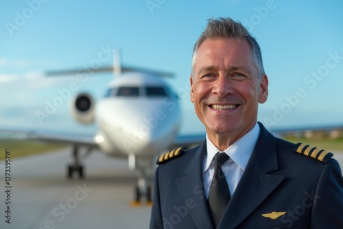 Head and shoulders portrait of a Saint Kitts and Nevis smiling 50 years old male airplane captain pilot in uniform.