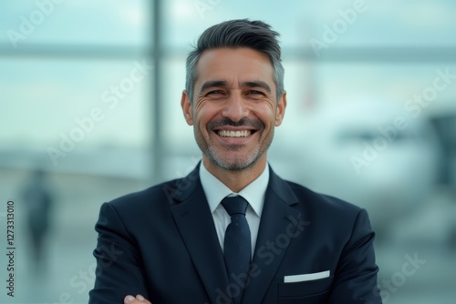 Head and shoulders Portrait of an elegant stylish Egyptian 50 years old male flight attendant in uniform.
