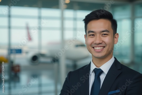Head and shoulders Portrait of an elegant stylish Guatemalan young male flight attendant in uniform.