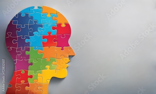 Head made of colorful puzzle pieces. Abstract watercolor representation of mental health. Concept for thinking, making decision, neurodiversity, disability