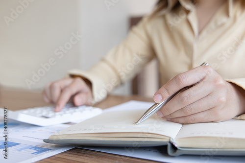 Head of accounting is recording the company's financial growth statistics using graphs as a reference for reviewing and analyzing the results, Taking notes and analyzing data graphs in office.