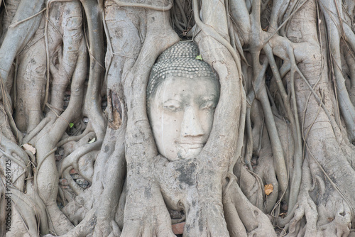 Head of Buddha statue in the tree roots at Wat Mahathat temple, Ayutthaya, Thailand