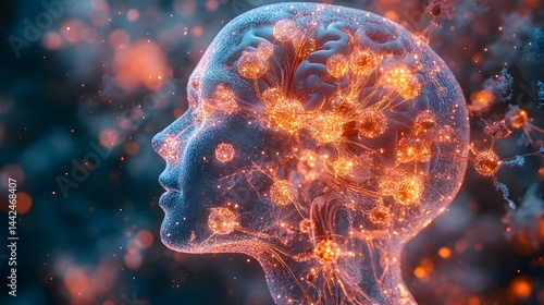 Head Profile with Visible Brain Structure Glowing and Firing Neural Network Connections in Abstract Form with Bokeh Lights