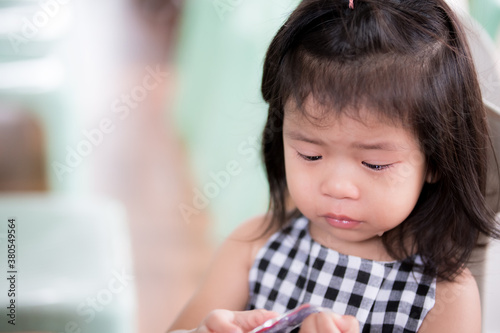 Head short. Cute girl was crying and wanting snack. Child begged to eat dessert. Little kid lowered his head with tears flowing on his cheek and looked at the candy bag. Children are 3 years old.