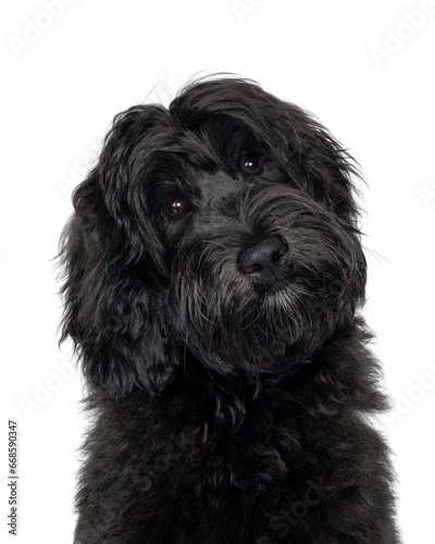 Head shot of gorgeous young black Labradoodle dog, sitting up facing camera. Looking beside camera with cute head tilt. Isolated on a white background.