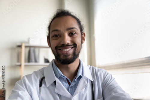 Head shot smiling friendly young african american multiracial general practitioner physician doctor in white uniform looking at camera, holding distant video call meeting, consulting patient distantly