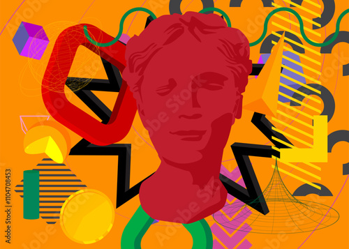 Head Statue geometrical graphic retro theme background. Minimal geometric elements. Vintage abstract shapes vector illustration.