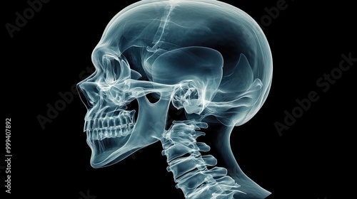 Head x-ray image, detailed skull bones and jaw, 3D illustration