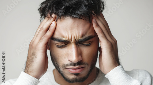 Headache in a man. Portrait of a young man with hands on his head on a simple isolated background