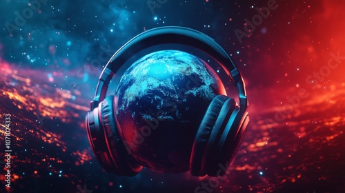 headphones on the earth with neon colored background. world radio day concept