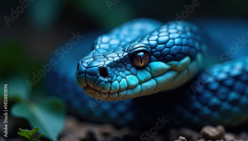 Headshot of blue viper snake with sharp teeth and piercing stare, snake, close-up, animal