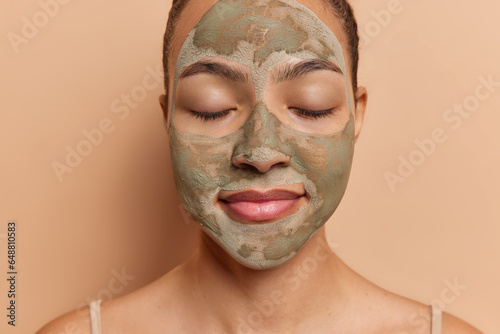 Headshot of young Latin woman applies facial clay mask has eyes closed undergoes beauty procedures for refreshing skin stands bare shouldered isolated over brown studio background. Cropped image