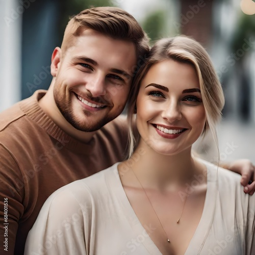 headshot photo of a young white Caucasian couple in love smiling man and woman, looking into the camera.