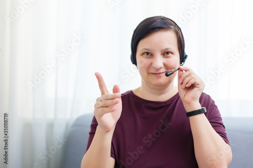 Headshot portrait of smiling young woman. girl with happy facial expression looking at camera with joy, communicating with friends via internet telephony, making video call. Close up. Front view