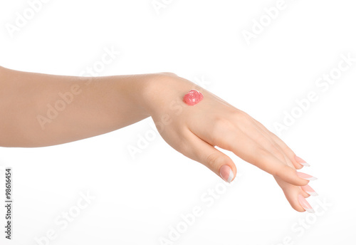 Health and body care theme: beautiful female hand with pink scrub cream on a white background isolated