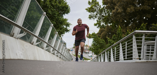 Health, black man and running for fitness, workout and training for marathon, wellness or endurance. African American male, athlete or runner outdoor, exercise and practice for competition or balance