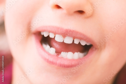 Health care and dental hygiene concept. Close up portrait of little girl without milk teeth.