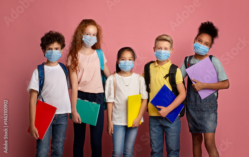 Health care and education concept. Portrait of schoolchildren wearing protective masks against pink background