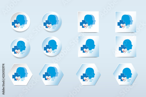 Health care icon vector showing profile silhouette of man and woman in circular, square and hexagonal shapes, All is on the light blue background.