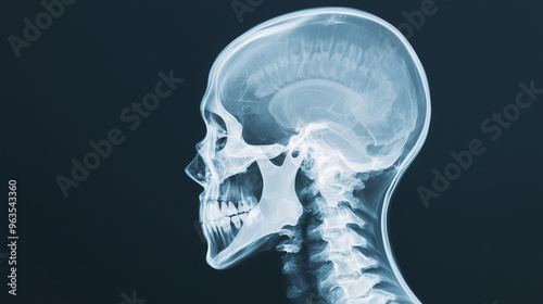 Health Examination: Detailed X-Ray Image of a Human Skull, Highlighting the Skeleton for Medical Diagnosis of Neck Pain or Headache. photo