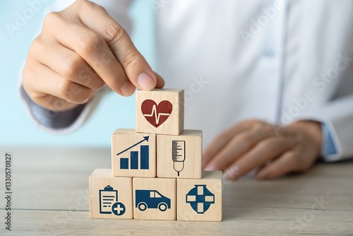 Health insurance and medical care concept. A set of wooden blocks displaying health-related icons, medical care, health insurance, and medication. healthcare services, protection, insurance coverage,