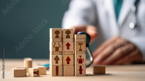 Health Insurance concept, Hand of medicine doctor holding wood block and stacking. Generative ai