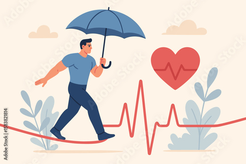 Health insurance, medical risk, healthcare protection, patient security, disease and illness care concept, strong man with umbrella, walking on risky heart line, metaphor for health safety