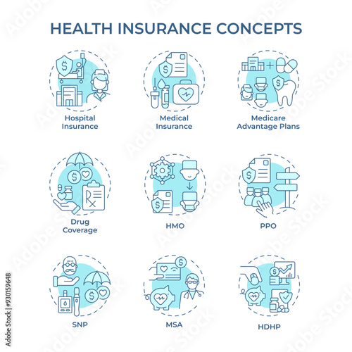 Health insurance soft blue concept icons. Medical coverage. Hospital insurance. Health plans. Healthcare provider. Icon pack. Vector images. Round shape illustrations. Abstract idea