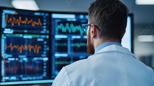 Health professional analyzing patient data medical facility digital display clinical environment expert insight health info