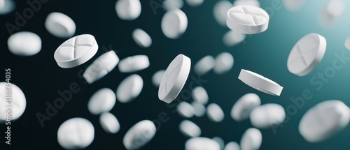Healthcare and medicine concept with flying white tablets, symbolizing pharmaceuticals, prescription drugs, and innovative medical treatments