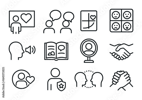 Healthcare Empathy Icons. Outline vector icons of healthcare empathy training: training screen, role-play icon