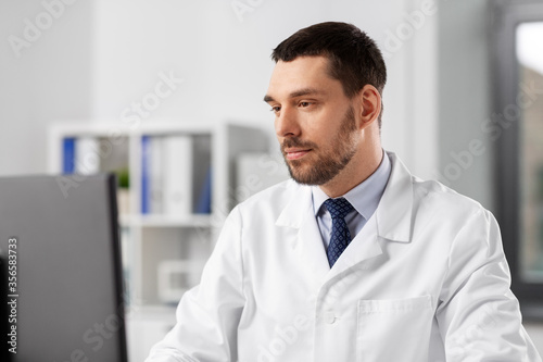 healthcare, medicine and people concept - male doctor with computer working at hospital