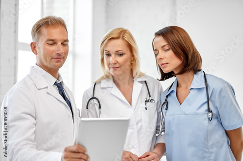healthcare, medicine and technology concept - group of doctors with tablet computer at hospital