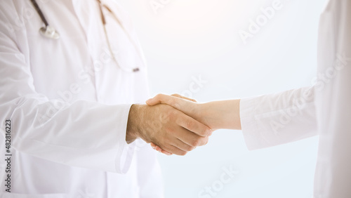 Healthcare, medicine concept: Doctors in lab coats greeting each other with handshake isolated over grey color background
