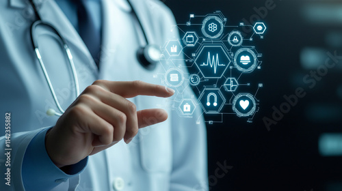 healthcare professional interacts with virtual health icons, showcasing digital technology in medicine. This highlights innovation and future of healthcare