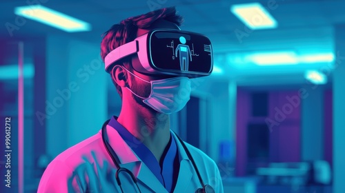healthcare professional wearing virtual reality headset in modern medical environment, showcasing integration of technology in healthcare. scene is illuminated with vibrant blue and pink lighting