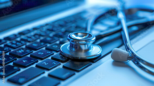 Healthcare technology theme with a stethoscope on a laptop keyboard close-up view blue and silver color scheme professional and detailed